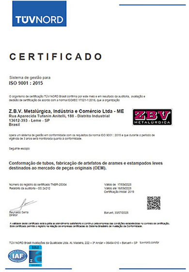 A ZBV Metalúrgica orgulha-se de possuir a certificação ISO 9001:2015, um reconhecimento global do nosso compromisso com a qualidade e a excelência. Essa certificação reflete a eficiência de nossos processos e a dedicação em superar as expectativas dos clientes, garantindo produtos e serviços que atendem aos mais altos padrões do mercado. Com foco na melhoria contínua, inovação e gestão responsável, a ZBV Metalúrgica entrega soluções que combinam precisão, confiabilidade e resultados superiores, consolidando-se como referência no setor metalúrgico.